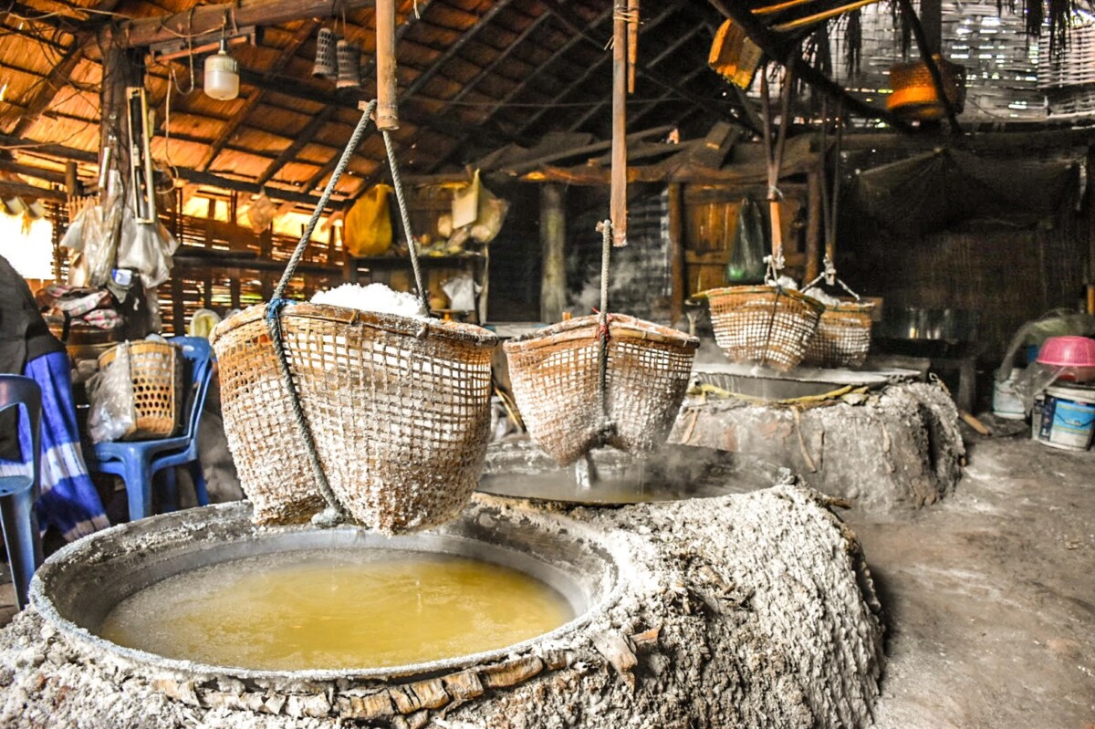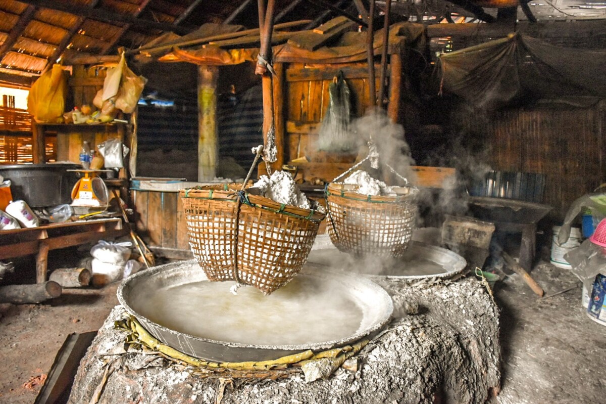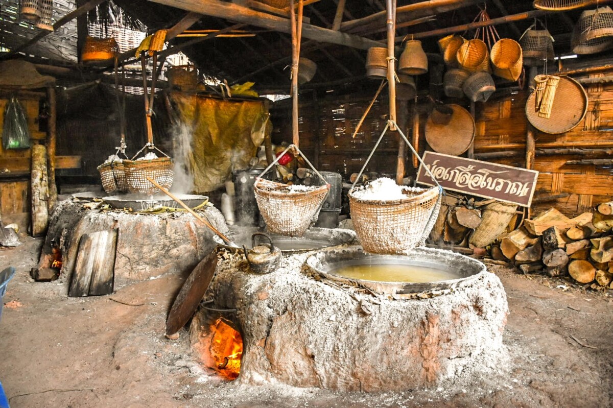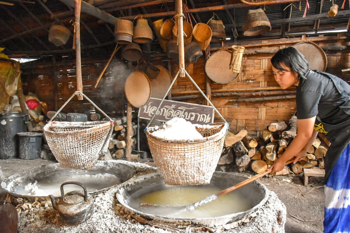 ปัจจุบันชาวบ้านยังคงต้มแกลือด้วยวิธีแบบดั้งเดิม โดยจะตักน้ำเกลือจากบ่อส่งผ่านมาตามลำไม้ไผ่สู่บ่อพัก การทำเกลือของชาวบ้านบ่อเกลือ จะนำน้ำเกลือที่ตักจากบ่อมาต้มในกะทะประมาณ 4-5ชั่วโมง ให้น้ำเกลือระเหยแห้ง จากนั้นก็จะนำไม้พายมาตักเกลือใส่ตะกร้าที่แขวนไว้เหนือกะทะ เพื่อให้น้ำเกลือไหลลงมาในกะทะทำอย่างนี้ไปเรื่อย จนน้ำในกะทะแห้งหมดแล้วจึงตักน้ำเกลือจากบ่อมาใส่ลงไปใหม่ เกลือของที่นี่จะมีผลึกดอกเกลือที่สวยงามต่างจากเกลือที่อื่น และแอบรู้มาว่า เกลือแห่่งนี้มีแร่ธาตุภูเขาที่เต็มไปด้วยด้วยสรรพคุณทางยาอีกมากมาย แต่เกลือบ่อเกลือนี้ไม่มีสารไอโอดีนเหมือนเกลือทะเลนะครับ…